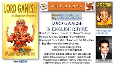 Book Lord Ganesh covers Lord Ganesh’s Primer, Mantras, Chalisa, Ganapati Atharvashirsha Upanishad, Stuti, Kirtan, Bhajan, and his Arti written in English rhyme with the original text.